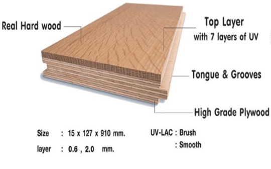 1.ชั้นผิวหน้าไม้จริง เช่น ไม้โอ้ค ไม้แอช ไม้บีช ไม้มะค่า ไม้สัก ไม้เมเปิ้ล ไม้วอลนัท และ อื่นๆ อีกมากมายที่มีความหนา 3 มิลลิเมตร